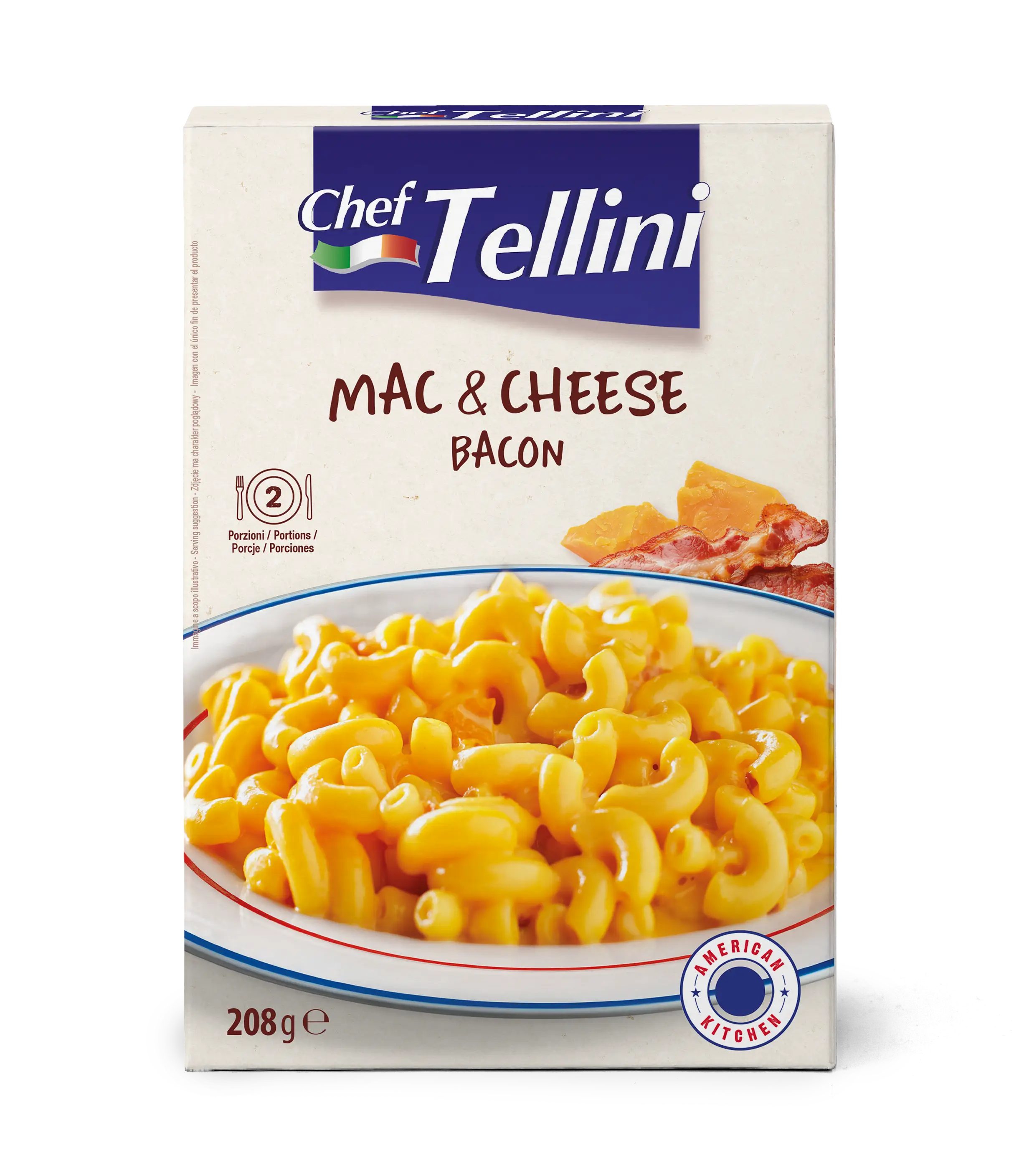 Pasta 81% (durum wheat semolina), whey powder (contains milk), processed cheese powder 3.8% (contains milk), sunflower oil powder (non-hydrogenated, high oleic sunflower oil, glucose syrup, milk proteins), flavourings (contain milk), modified starch E1422, potato starch, bacon 1% [pork belly (pork belly, salt, antioxidant E301, pepper, flavourings) rice flour, salt], salt, spices. May contain traces of egg, soy, mustard.