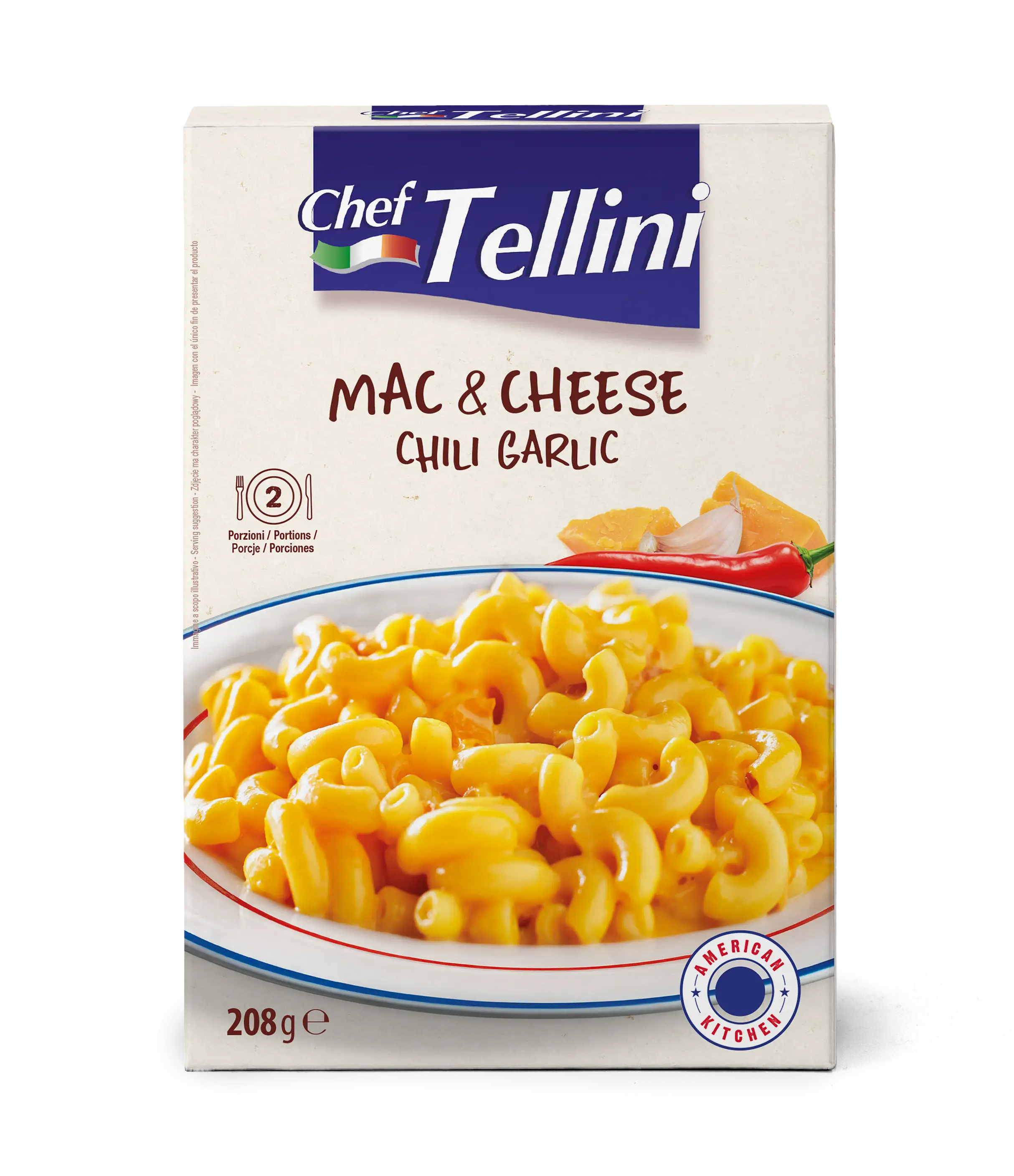 Pasta 81% (durum wheat semolina), whey powder (contains milk), processed cheese powder 3.8% (contains milk), sunflower oil powder (non-hydrogenated, high oleic sunflower oil, glucose syrup, milk proteins), modified starch E1422, salt, natural flavourings (contain milk), potato starch, salt, garlic 1%, chilli pepper 0.1%, spices. May contain traces of egg, soy, mustard.