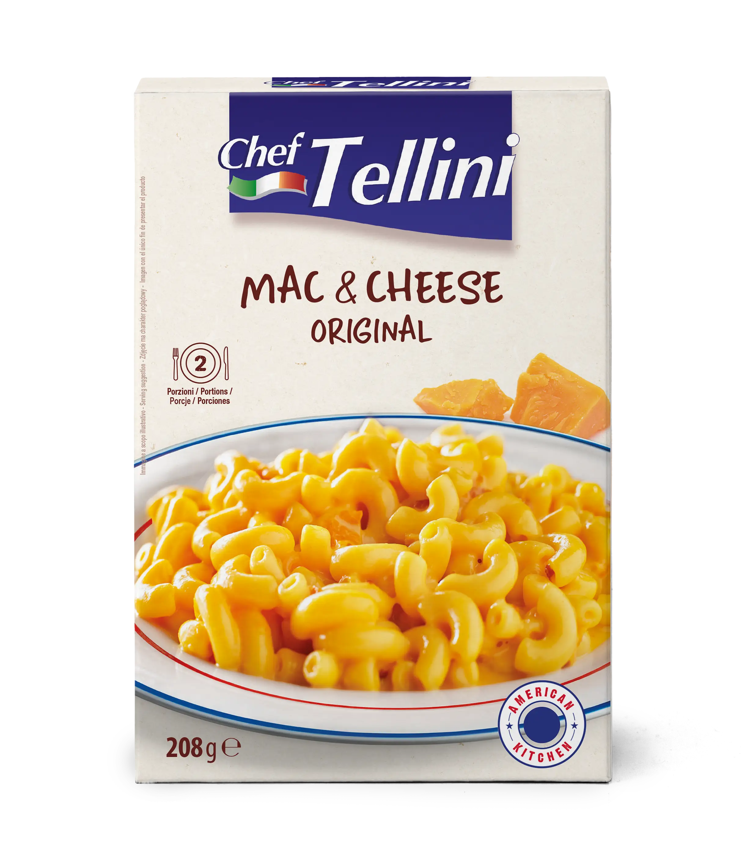 Pasta 64% (durum wheat semolina), melted cheese powder (milk), oil of sunflower oil powder (non-hydrogenated high oleic sunflower oil, glucose syrup, milk protein), maltodextrin, modified corn starch, natural flavors (contain milk), potato starch, salt, turmeric. May contain traces of egg, soy, mustard, celery.