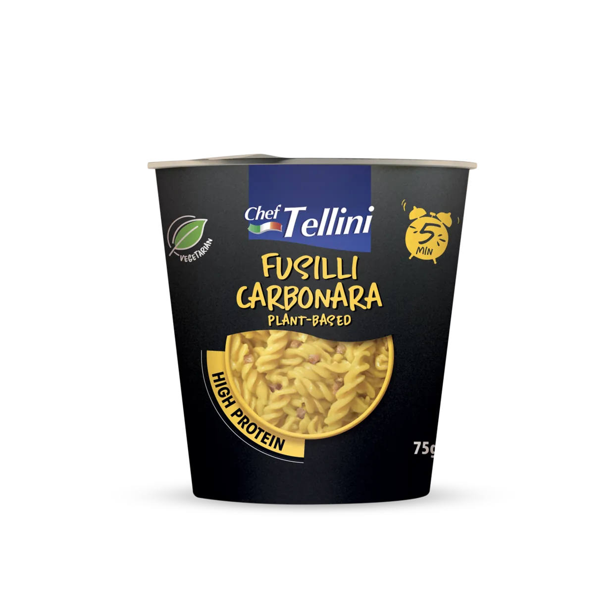 Protein pasta (durum wheat semolina, isolated pea protein) 52%, pea protein 21.3%, whey powder (contain milk), potato starch, sunflower oil powder (non-hydrogenated high oleic sunflower oil, glucose syrup, milk protein), processed cheese powder (contains milk), flavourings (contain milk), salt, spices, garlic. May contain traces of egg, soy.