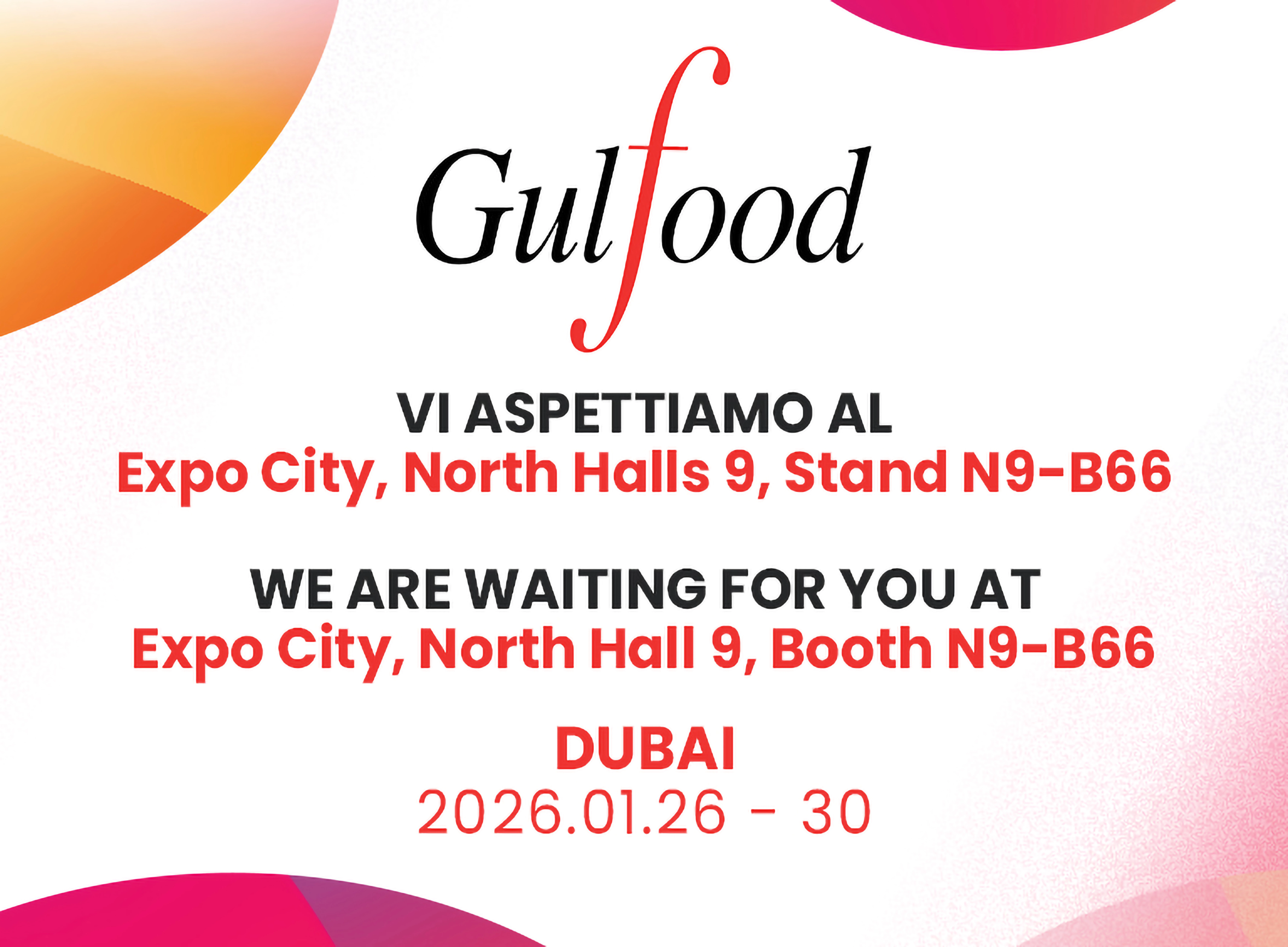 Saremo presenti dal 26 al 30 gennaio al Gulfood di Dubai.