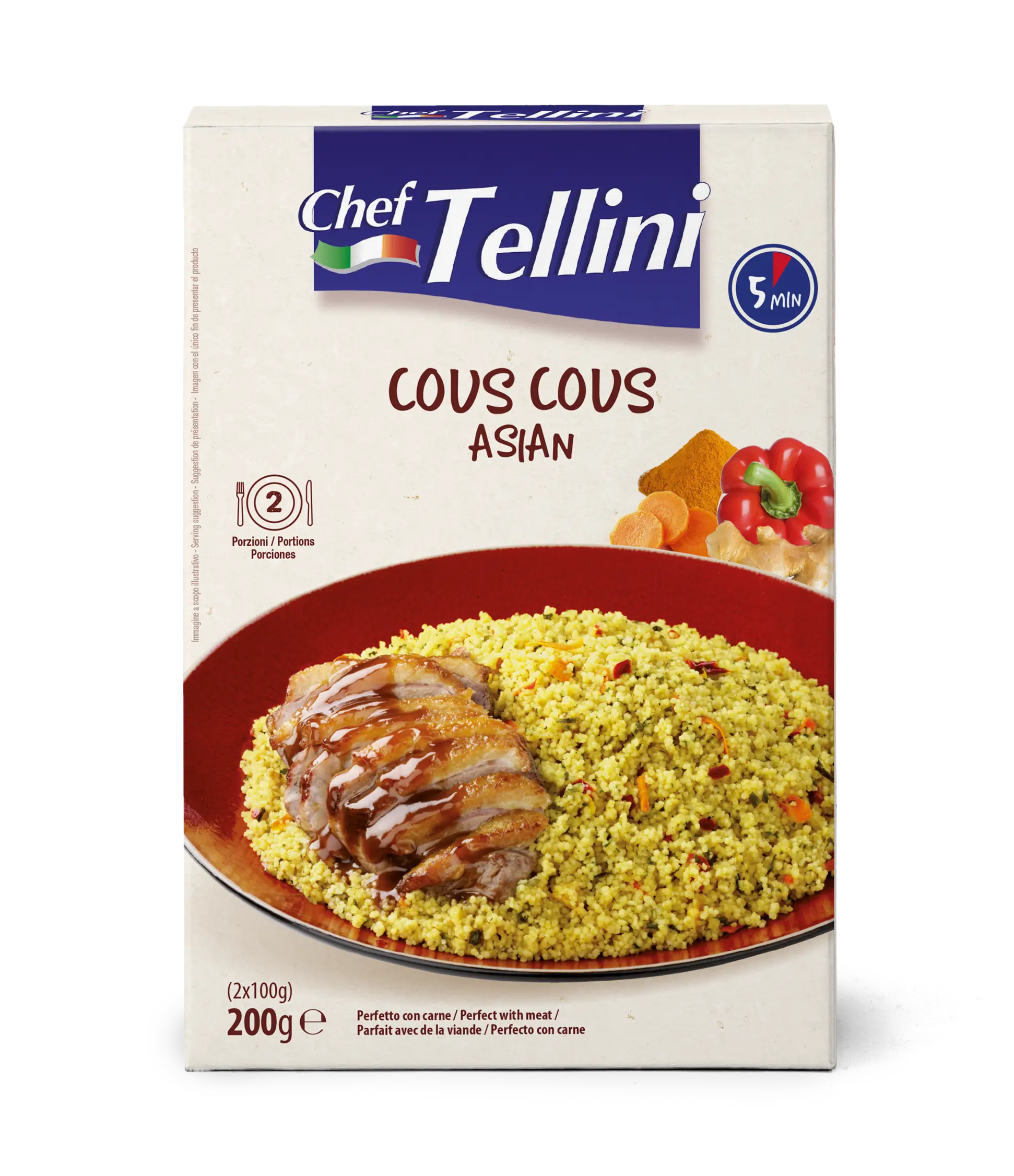 Cous cous 80% (semola di grano duro), maltodestrina, zucchero, cipolla, peperone rosso 2%, sale, curry 1,3%, carota, erba cipollina, aromi naturali, zenzero 0,7%, olio di semi di girasole, cumino, aglio, prezzemolo, pepe nero. Potrebbe contenere tracce di uovo, soia, senape, latte, crostacei, pesce, molluschi, sedano.